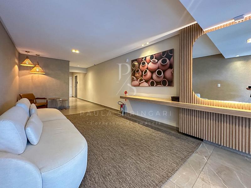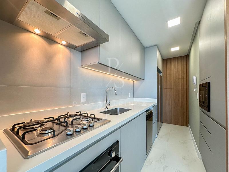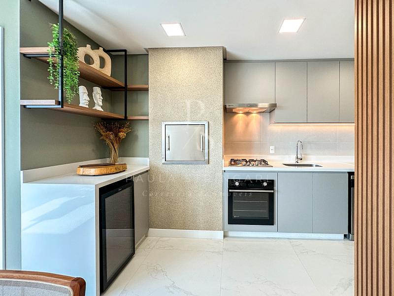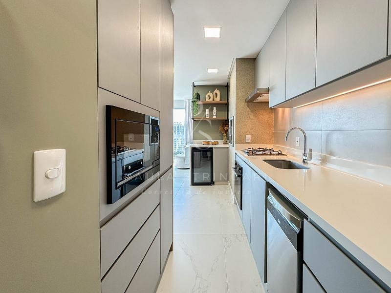 A sala integrada à cozinha moderna cria um espaço elegante, funcional e perfeito para receber familiares e amigos com conforto.