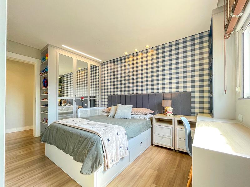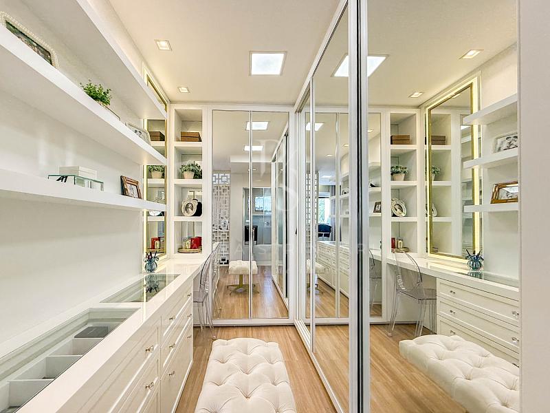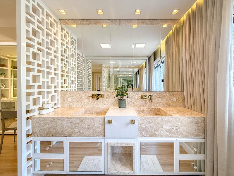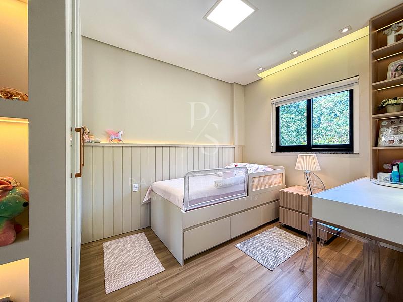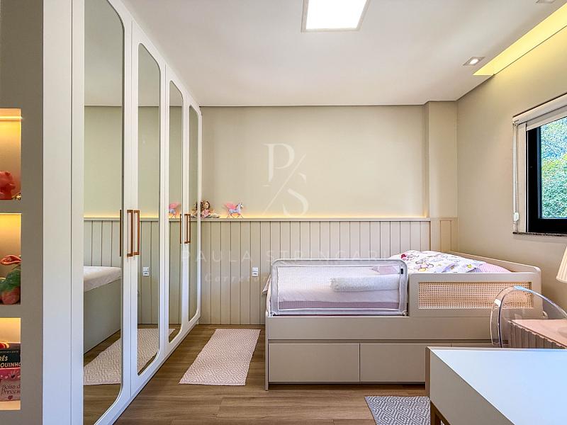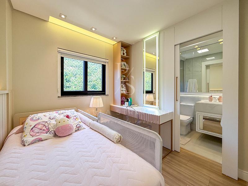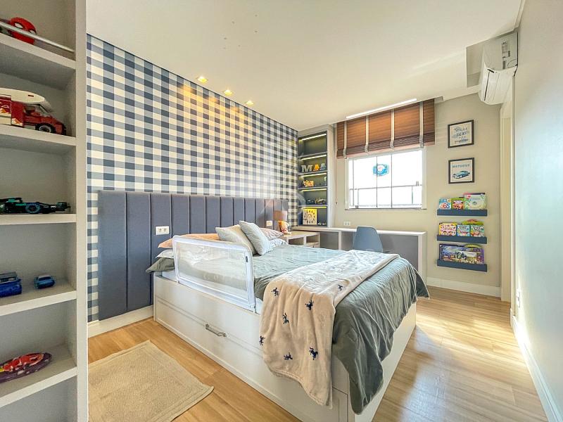 🔹 Suíte Máster: cama box king size, ar-condicionado inverter, móveis sob medida e lustre.