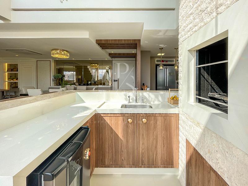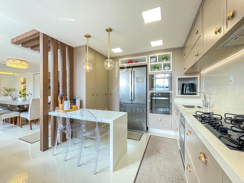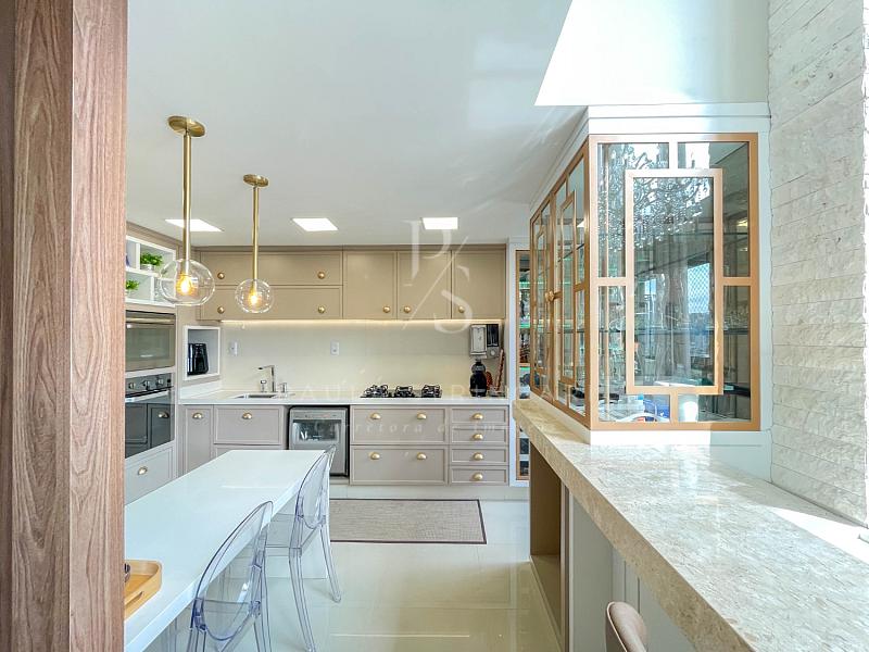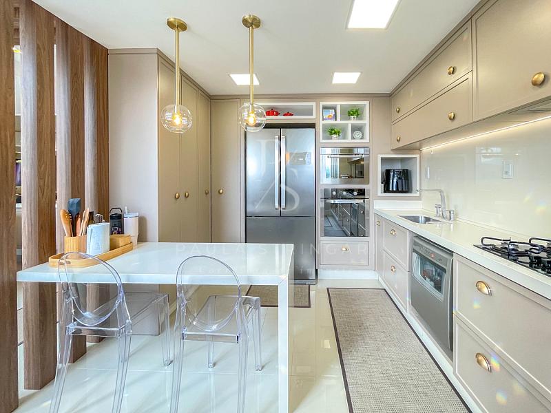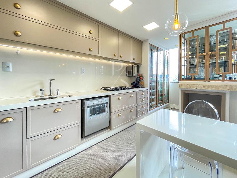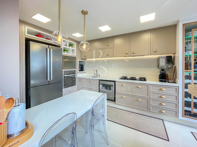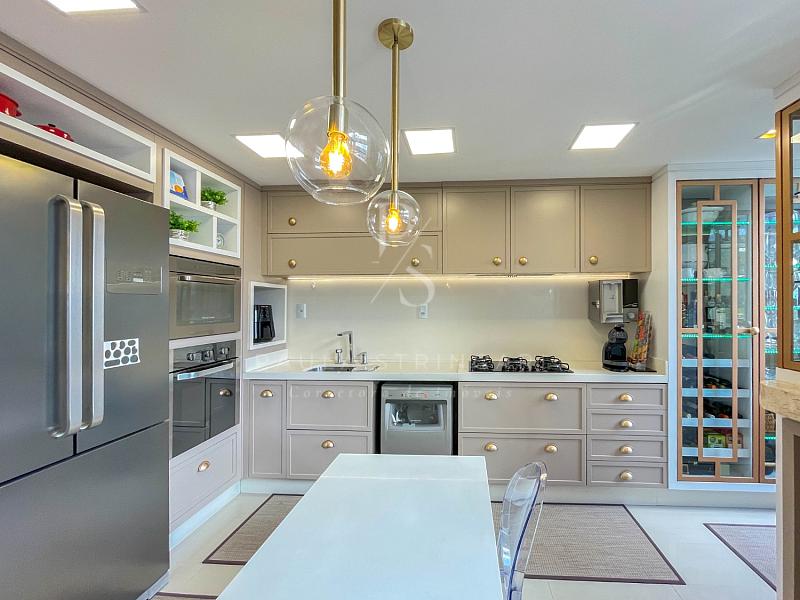 🔹 Cozinha: equipada com móveis planejados e eletrodomésticos de alto padrão (geladeira, fogão, coifa, lava-louça, filtro, micro-ondas e forno elétrico).